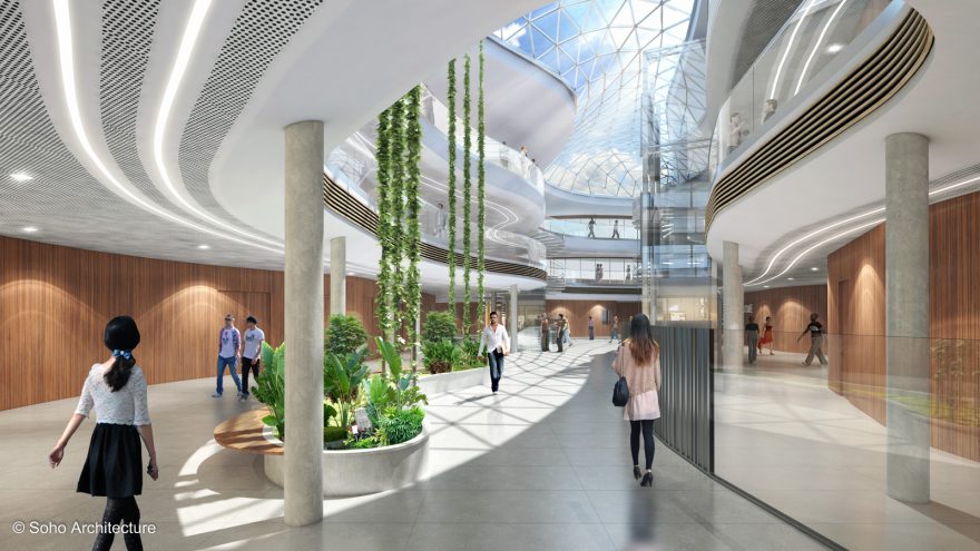The architectural concept based on fluidity and roundness aims to promote a better “living together”: at the center of everything, a huge atrium from which everything is connected. Moreover, the place provides some uncommon services in traditional companies, such as a breasting room for mums, and a collaborative kitchen, open to all, from partners to customers and young parents. The kitchen is also used for the marketing and R&D teams to test their new products, in collaboration with customers.