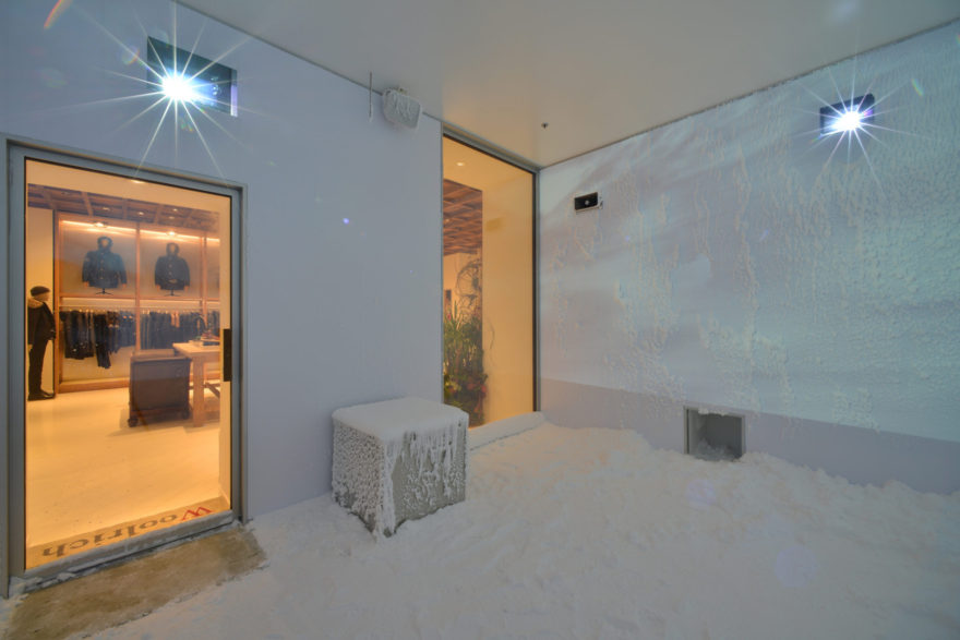 On avait déjà parlé du flagship Pirch, à New-York, qui proposait un magasin expérientiel où le visiteur pouvait tout tester, de la cuisine au pommeau de douche… Mais une fois de plus, une marque arrive à nous surprendre et pousse l’expérimentation encore plus loin. La marque américaine de vêtements d’extérieur Woolrich a ouvert il y a quelques mois un flagship en Italie (Milan) dans lesquels les consommateurs peuvent tester les vêtements en condition réelle de froid, grâce à une « chambre froide » dédiée. Cette cabine d’essayage hors-du-commun, imaginée par le studio japonais Wonderwall, reproduit des conditions météorologiques extrêmes, à savoir une température glaciale (jusqu’à -20°C) et de la neige !