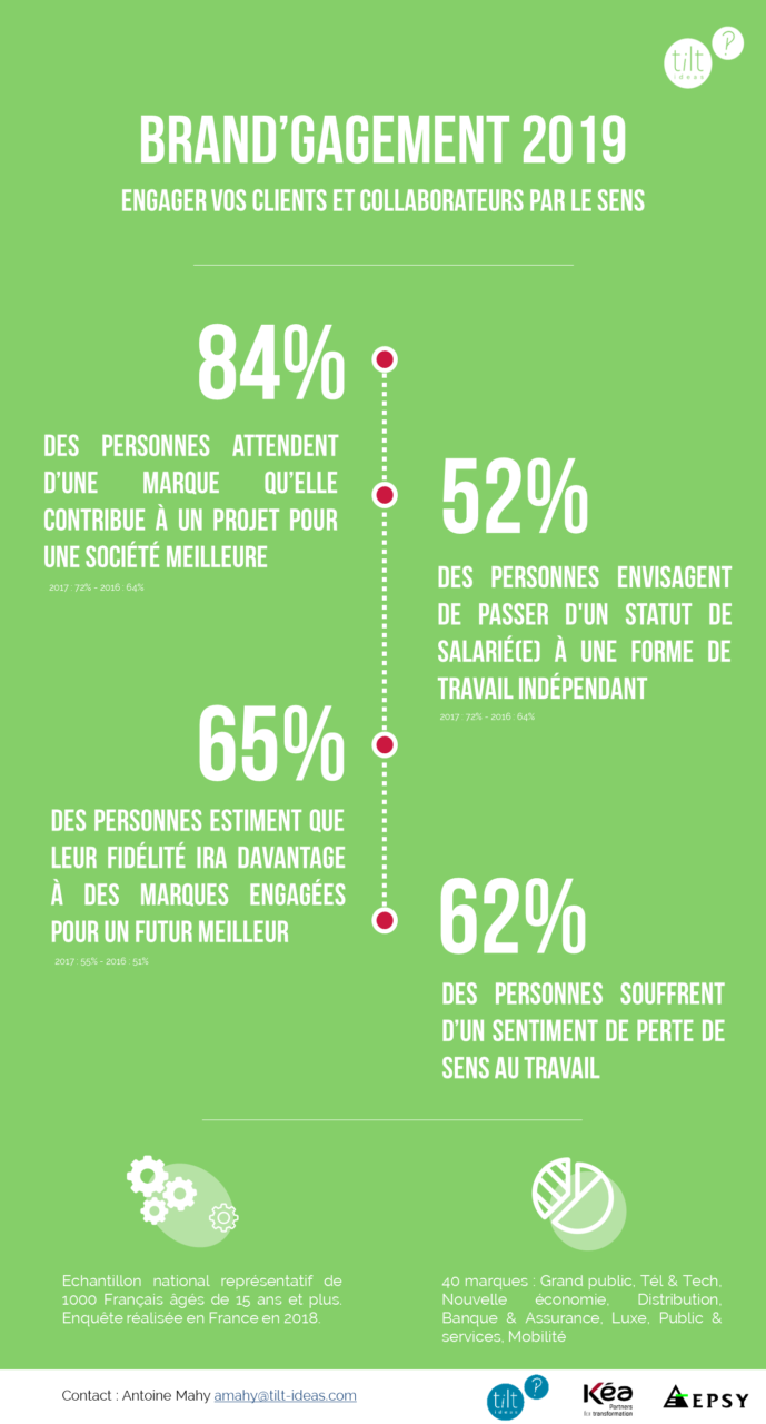 Aux entreprises qui ne sont pas encore convaincues du rôle clé de l’engagement ou qui ne savent pas comment s’attaquer à ce sujet, nous vous conseillons de regarder les quelques chiffres ci-dessous issus de la troisième édition de notre baromètre Brand’Gagement Tilt ideas / Epsy.
