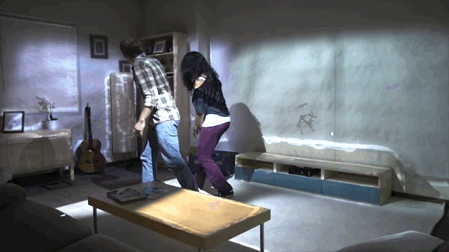 Ce n’est pas encore l’Holodeck de Star Trek mais cela s’en rapproche (celui-ci est d’ailleurs une des principales sources d’inspiration de ce concept). Un an après la présentation de son Illumiroom au CES, Microsoft Research renchérit avec Room Alive, un prototype encore plus évolué qui permet non seulement, comme l’Illumiroom, la projection d’une réalité virtuelle sur la surface tridimensionnelle d’une pièce mais surtout de faire interagir cette réalité avec tous nos mouvements (des yeux, du corps, toucher…), comme vous pouvez l’apprécier sur l’image animée ci-dessus.
