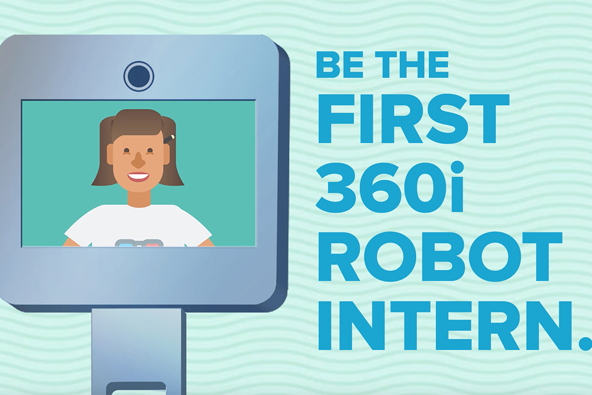 L’agence de publicité new-yorkaise 360i propose : la création d’un « robot-stagiaire ». Il ne s’agit pas de la robotisation d’un stage, mais d’un système robotisé de visioconférence qui permet à un stagiaire de travailler depuis chez lui, tout en faisant partie intégrante de l’équipe basée à Los Angeles. Pendant cinq heures par semaine, le stagiaire sera présent dans les bureaux de l’agence par le biais du robot BeamPro de la startup Suitable Tech. Mesurant près de 1m20, le robot lui permettra de suivre les autres employés, et de communiquer grâce à un écran à double sens lors des réunions et des présentations.
